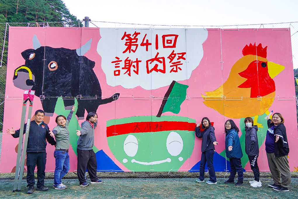 背面の大きな看板は、毎年恒例、大川小中学校の生徒が描いたものです。
