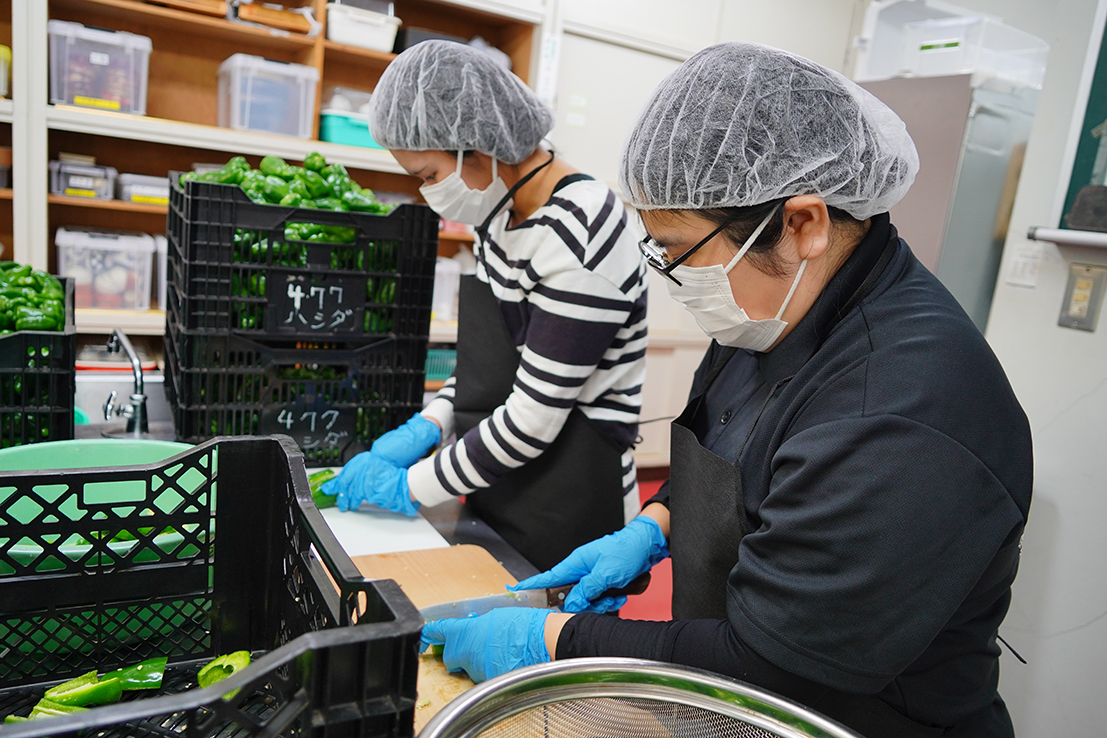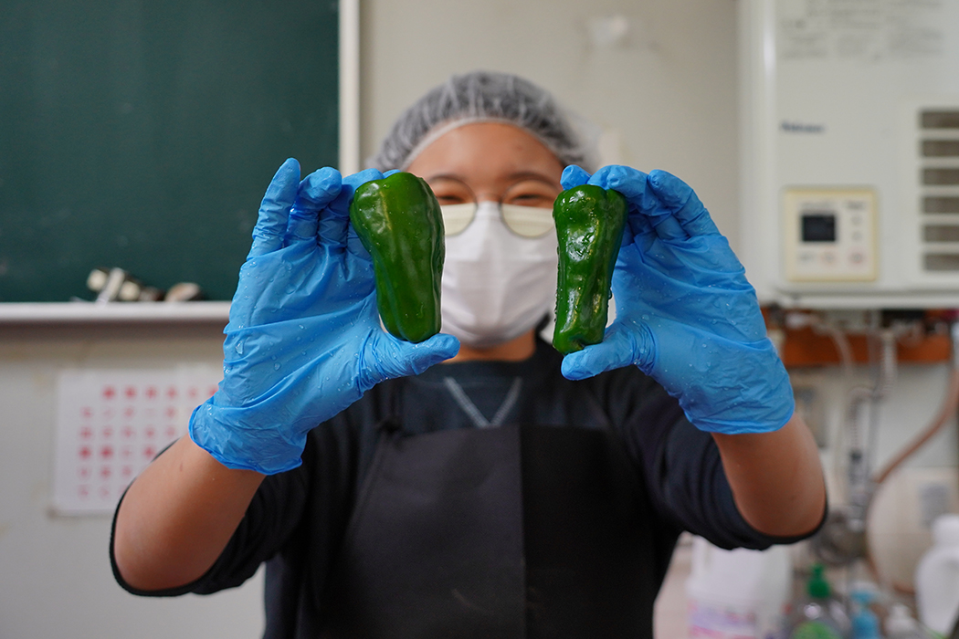 ひょうたんカボチャとピーマンは村内の農家さんがとれたてを届けてくれたもの。