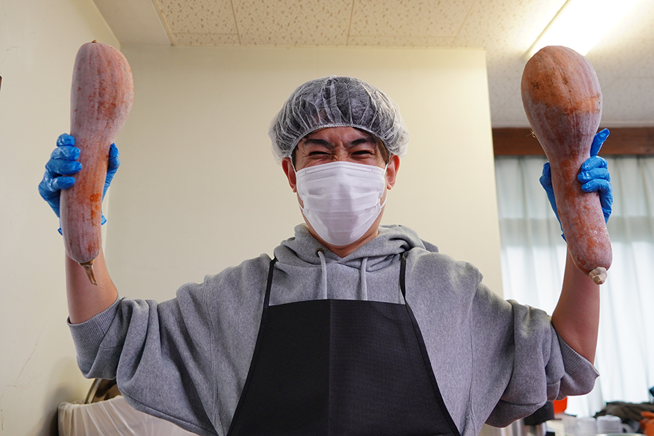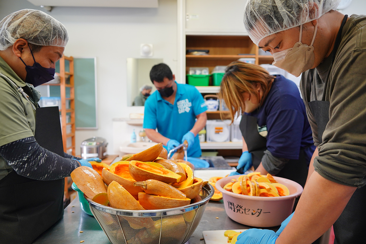 普段扱わないような大量のかぼちゃを前に「手が痛い~!」と笑いながら、みんなに均等に配れるよう丁寧にスライスしていきました!