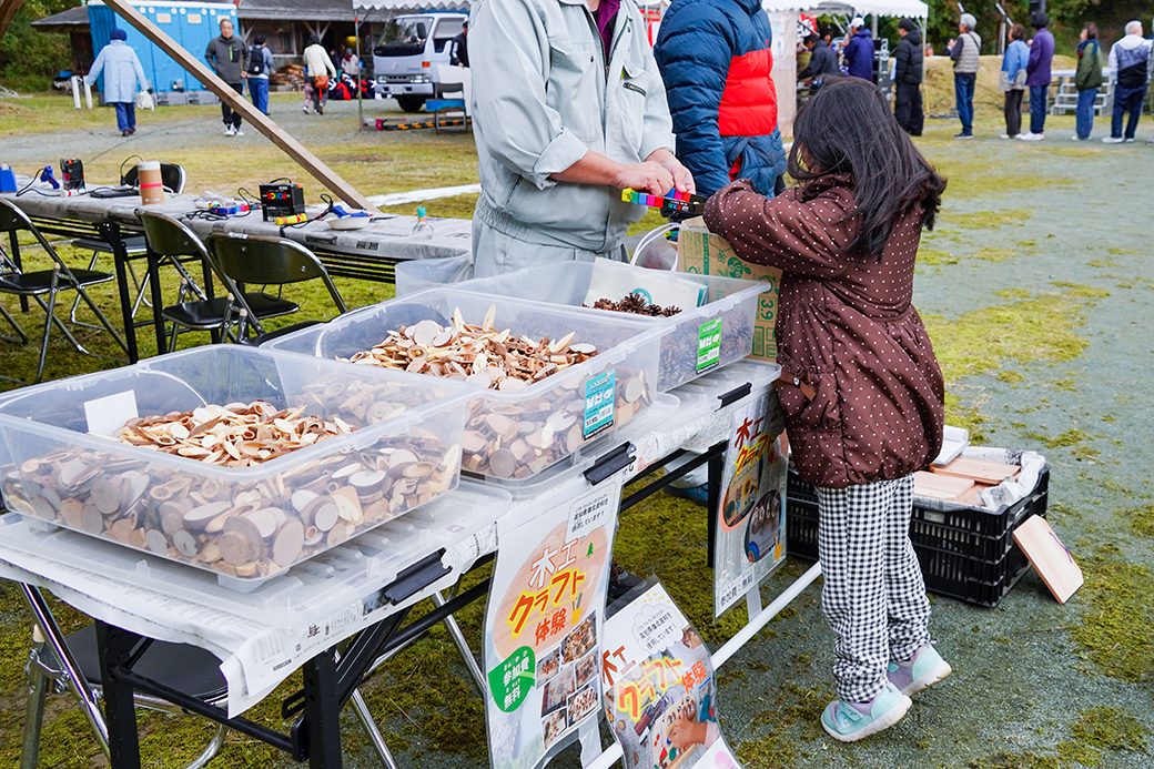 竹のおもちゃや木工体験コーナーでは、子どもたちが真剣な顔でおもちゃで遊んだり、レリーフを作ったり、お買い物を楽しんだり。