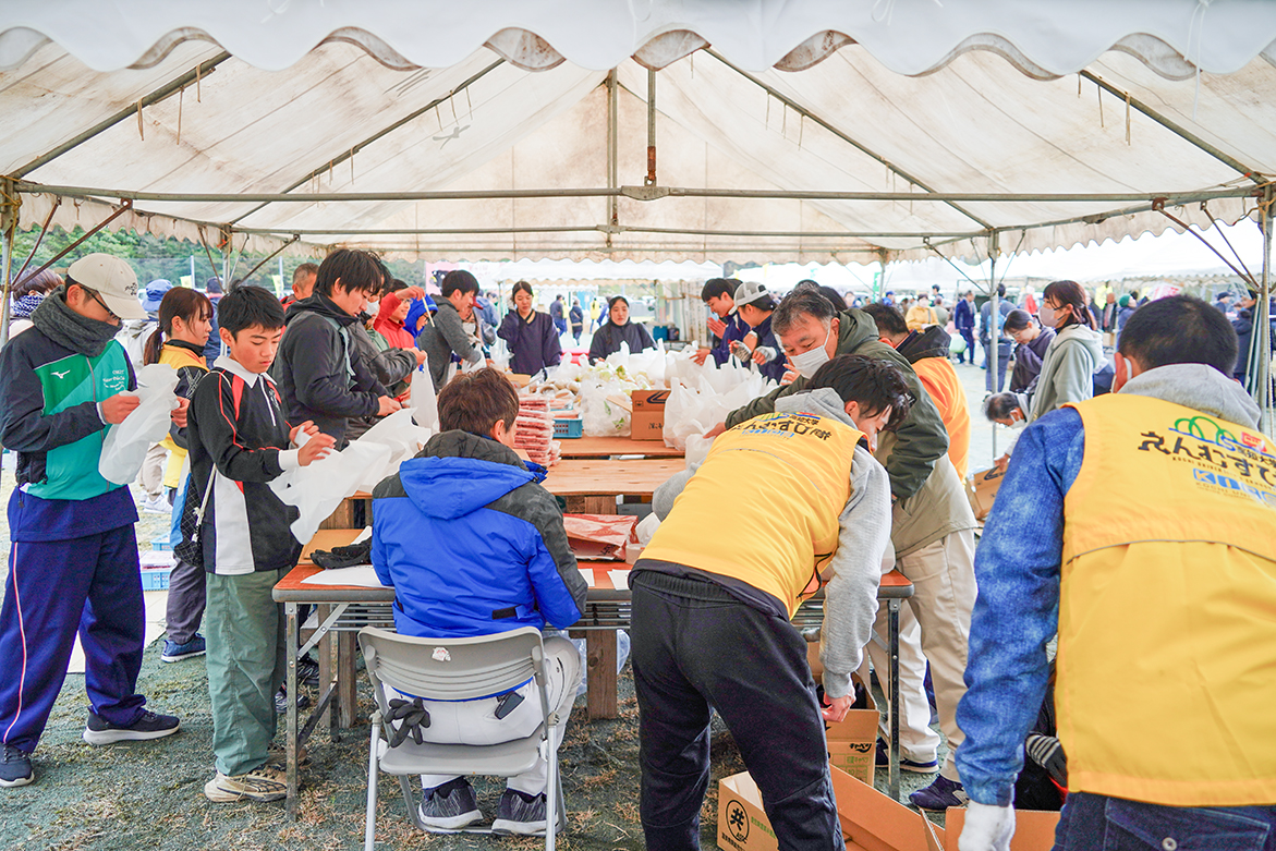 残った数少ないテントの下で、子供から大人まで村民総出で「まんぷくセット」を作る最後の仕上げ作業が行われています。